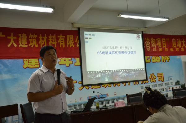 2015年7月14日,日照廣大建筑材料有限公司“6S規(guī)范化管理咨詢項(xiàng)目”啟動大會在研發(fā)中心大會議室隆重召開,公司董事長程永聚、副總經(jīng)理劉偉、許繡梅以及公司全體管理人員和各部門業(yè)務(wù)骨干近60人列席參會。項(xiàng)目啟動大會由辦公室主任王麗萍主持,明洋公司咨詢總監(jiān)王潤老師對廣大建材目前在企業(yè)管理方面尤其是生產(chǎn)管理方面存在的問題進(jìn)行簡單介紹,同時(shí)對此項(xiàng)目的咨詢內(nèi)容、推進(jìn)步驟、咨詢目標(biāo)、項(xiàng)目推進(jìn)計(jì)劃等做了詳細(xì)講解。